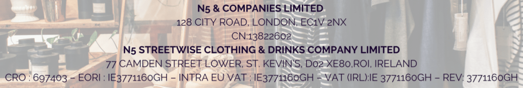 Now some 30 years on N5 Corporation & Group Companies with their SWISS HQ – USA, UK and EU representation have become a Venture Capital Conglomerate with interests in Real Estate, Beverage, Drinks, Grocery & Textiles, Media & Publications, Importers, Exporters, Wholesalers, Shipping & Logistics functionaries. Re- energized, re- branded, modernized- its new identity founded 2021/22 registered & accredited has evolved into an international multi-channel retailer of fashion, foodstuffs, homewares. Along with our real estate interests, imports and exports logistics. We are continuously developing and expanding our group brands and house labels such as Irish Brand, Canonbury of London, Restronguet sailing, Hampstead of London, Highgate Brand, Highbury Brand, Camden Town Brand Marylebone of London , Funky Arsenal , and Streetwise Clothing providing football branding to over 100 million Arsenal Gooners Worldwide along with many others from our prestigious Boutique Gallery of brands. This complements our drinks & beverages, Mediterranean grocery retail and wholesale foodstuffs along with our multi-media and advertising publications.